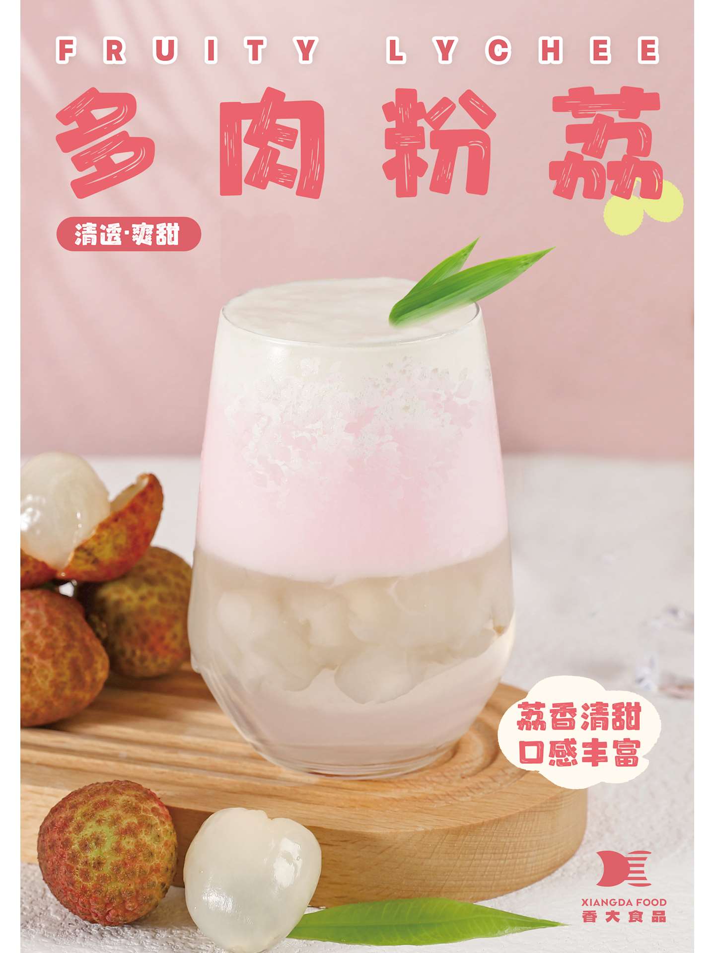 沙冰机中依次加入冷冻荔枝果茸、火龙果汁、益力多、 荔枝糖浆和冰块