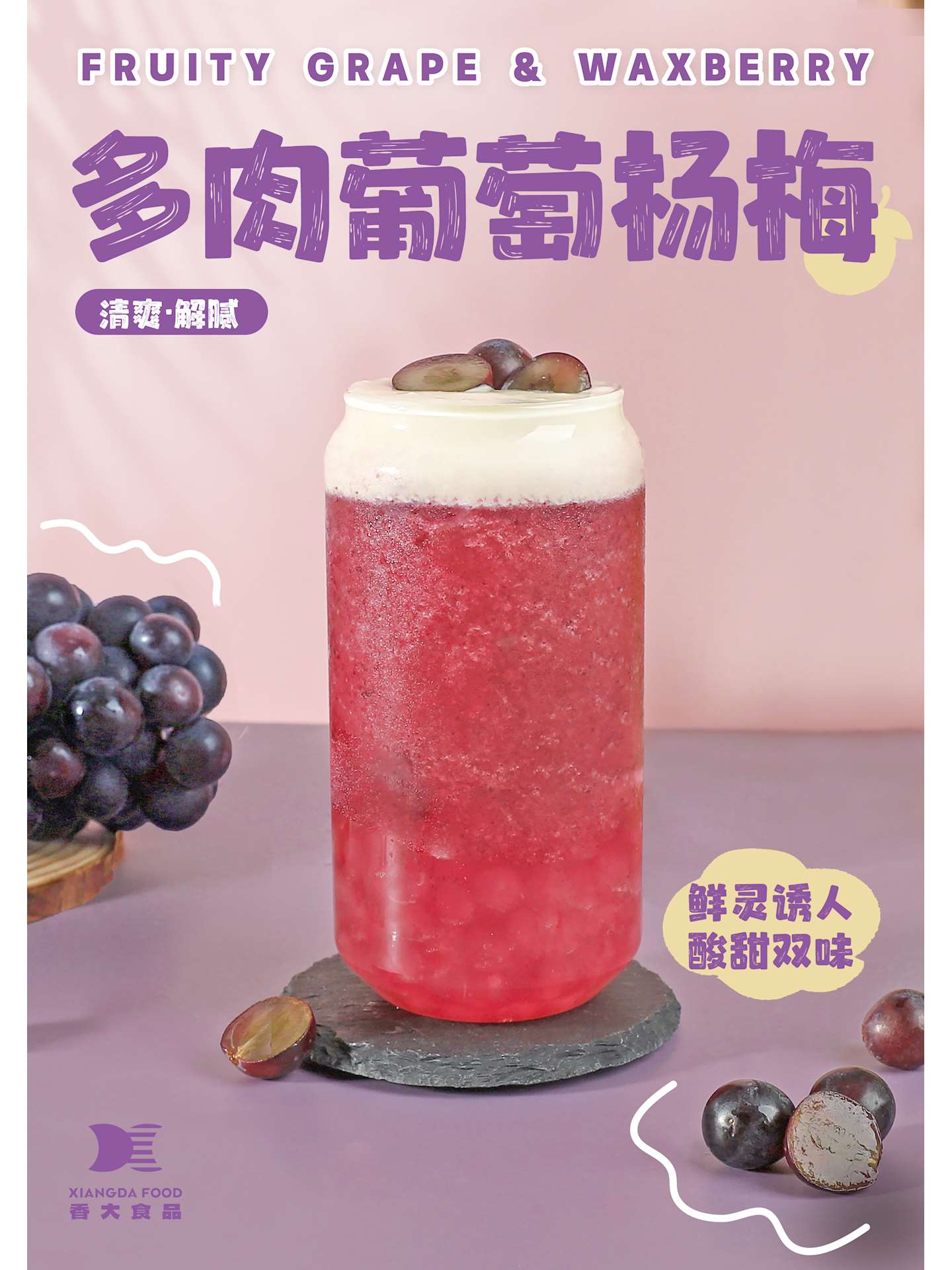 沙冰机中依次加入巨峰葡萄果酱、冷冻杨梅果茸、 茶汤和冰块